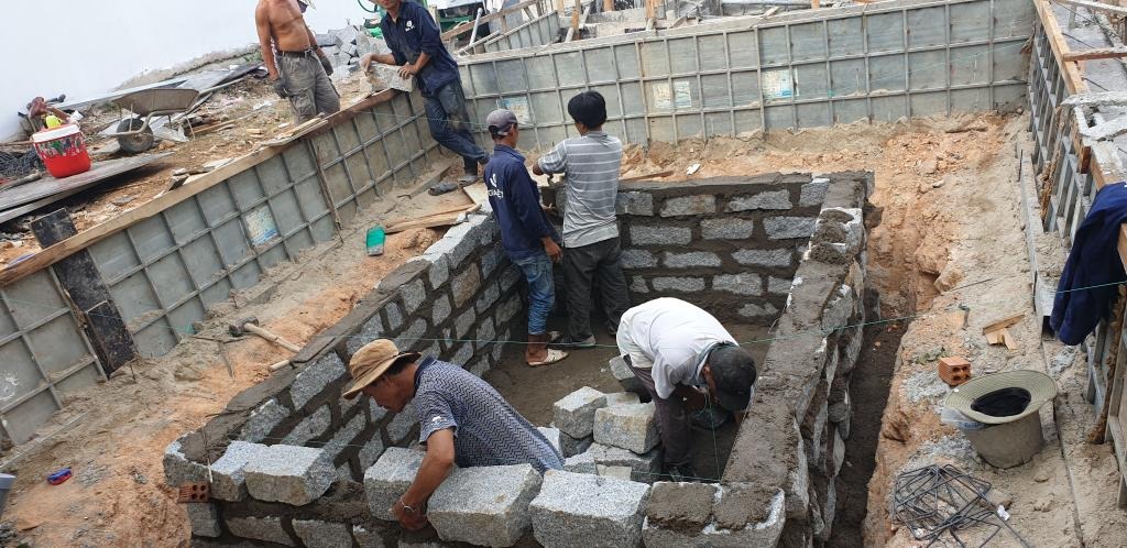 3. Xây thành bể phốt bằng đá chẻ đôi (kích thước 25x25x50)